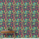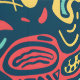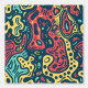 This artwork presents a vibrant and energetic abstract pattern filled with fluid, organic shapes and bold, contrasting colours. The composition is dominated by swirling forms in red, yellow, teal, and dark blue, creating a sense of movement and dynamism. The intricate details and varied lines give the piece a playful, almost hypnotic quality, reminiscent of 1960s and 70s psychedelic art. The design is both chaotic and harmonious, drawing the viewer into its complex, immersive world.