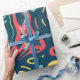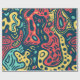 This artwork presents a vibrant and energetic abstract pattern filled with fluid, organic shapes and bold, contrasting colours. The composition is dominated by swirling forms in red, yellow, teal, and dark blue, creating a sense of movement and dynamism. The intricate details and varied lines give the piece a playful, almost hypnotic quality, reminiscent of 1960s and 70s psychedelic art. The design is both chaotic and harmonious, drawing the viewer into its complex, immersive world.