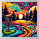 A colourful disc golf course with a disc golf basket, full moon, and flying discs at sunset in the woods. Pink, blue, orange colourful ai art.