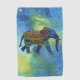 This golf towel shows a stunning artistic elephant, overlaid on a cool blueish green background.