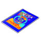 The design is dominated by a bold royal blue background, framed with striking yellow/gold borders. The centre features a kaleidoscopic arrangement of circles and patterns in cyan, red, yellow, and magenta, creating a mesmerizing, energetic focal point. Large, stylized text fragments add to the urban, graffiti-like texture of the piece. This piece is a perfect statement for anyone who loves pop art, abstract design, and bold, contrasting colours.