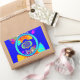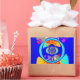 The design is dominated by a bold royal blue background, framed with striking yellow/gold borders. The centre features a kaleidoscopic arrangement of circles and patterns in cyan, red, yellow, and magenta, creating a mesmerizing, energetic focal point. Large, stylized text fragments add to the urban, graffiti-like texture of the piece. This piece is a perfect statement for anyone who loves pop art, abstract design, and bold, contrasting colours.