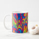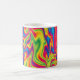 A mug featuring a colourful and abstract psychedelic design with wavy patterns.