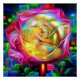 A mesmerizing digital painting of a rose bursting with psychedelic energy and rainbow hues. The vivid pink petals wrap around a glowing golden core, creating a surreal floral centerpiece.