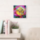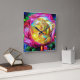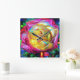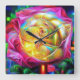 A mesmerizing digital painting of a rose bursting with psychedelic energy and rainbow hues. The vivid pink petals wrap around a glowing golden core, creating a surreal floral centerpiece.