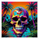 A.I .created print of a vibrant multicoloured skull is surrounded by lush green leaves, creating a striking contrast between natural elements and psychedelic, surreal imagery.