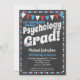 A fun and unique psychology degree graduation party invitation in chalkboard style with red, white and blue flags and a whimsical polka-dot border with dots on the back.