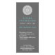 Une carte rack qui attire l'attention. Un ornement de type huilé attire le spectateur au centre de cette carte en utilisant un traitement de type propre qui suggère un environnement serein. Un joli turquoise est utilisé à l'arrière avec l'ornement répété deux fois dans une légère transparence sur elle. Carte promotionnelle idéale pour un salon ou un spa, un massothérapeute ou un professionnel du bien-être, ou un magasin de cadeaux, de vêtements ou d'accessoires. Disponible en couleurs alternatives avec produits correspondants. com