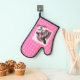 A whimsical and fun oven mitt with a pink and white polka dotted background, a dressed up black and white cow wearing pink glasses, pink dress, and pearls. Lace frame around the cow and the saying, Pucker Up Buttercup! in the corner.