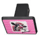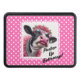 A whimsical and fun trailer hitch cover with a pink and white polka dotted background, a dressed up black and white cow wearing pink glasses, pink dress, and pearls. Lace frame around the cow and the saying, Pucker Up Buttercup! in the corner.