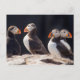 Photograph of 4 puffins looking in opposite directions on rocks at Farne islands, Northumberland.
