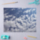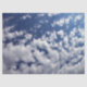 A bank of puffy white clouds breaks into small wispy pieces across the frame of the vertical photograph. The cloud cover is denser on the left and more sparse on the right, revealing a deep blue sky that is dark near the top of the photo and lighter near the bottom. Late afternoon sun highlights the right edges of the cumuli. It looks like torn apart cotton balls suspended in air.