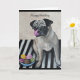 A pug with a plate of macarons sitting on a black and white tablecloth.