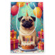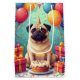 A fun and cheerful birthday scene featuring a Pug enjoying a festive celebration surrounded by colourful balloons, presents, and a bright birthday cake. The playful expression and lively details create a joyful design full of charm and personality