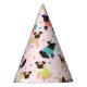 Cute birthday party Pug dogs with black and tan coats dressed in cute birthday outfits with balloons, cake and confetti pattern.