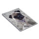 A fawn pug with a black face standing on the photographer's knee looking into the camera.