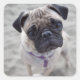A fawn pug with a black face standing on the photographer's knee looking into the camera.