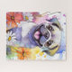 A digital art image of a cheerful pug with big eyes and a wide smile is surrounded by colourful daisies. The background features vibrant splashes of watercolor hues, enhancing the joyful and lively atmosphere.
