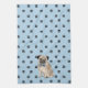 An adorable little Pug dog wears a bow tie at one end of this cute kitchen towel. The dog image is placed on a black paw print and light blue background. Perfect for anyone who has lost their heart to a Pug!
