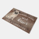 Funny beware of the wet kisser" Pug Dog door mat set on a rustic faux background. Visit our shop to view a large assortment of dog breads