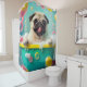 The overall colour scheme of the design is bright and cheerful, with shades of blue and white for the water and bubbles, and pops of yellow and orange for the rubber duck and showerhead. The text accompanying the design may feature humourous or punny phrases related to bathing or pugs, adding to the fun and playful tone.