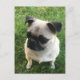 Adorable pug puppy sitting on grass, looking to the side on portrait photograph.