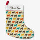 Pug lover's Christmas stocking with custom text for your name or the name of your furry friend. Colourful dog silhouettes pattern.