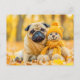 pug with a plush toy in an autumn forest, highlighting cozy companionship amidst fall foliage
