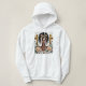 Cette image montre une personne vêtue d'un sweat - shirt à capuche blanc avec un design proéminent sur le devant. La conception graphique comprend une illustration détaillée d'une femme aux cheveux bouclés foncés, portant un bandeau imprimé léopard. Ses mains sont jointes dans une pose de prière, et elle a une expression calme et sereine. Derrière elle se trouve une croix dorée, symbolisant la foi, entourée d'éléments floraux comme les roses et la verdure. Sous l'image, le mot BELIEVE est imprimé en lettres majuscules en gras, servant de message central du design. Le sweat - shirt à capuche a un ajustement décontracté avec une poche avant et des tiroirs.