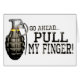 Go ahead, pull my finger. For most the pulling of another's finger, especially if it's dad or even an uncle's is silly potty humour often resulting in only a fart that will surely cause a few giggles and maybe even widespread laughter. Our pull my finger design features an old hand grenade with the classic slogan. Caution: Beware the one who wears this tee as you have been forewarned that an unimaginable explosion of nasty will surely overcome you should you decide to pull that finger.