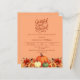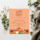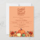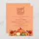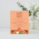 An atomic tangerine background colour. Decorated with pumpkins and orange and yellow flowers. Personalize and add the party details.