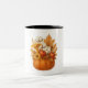 Beautiful watercolor illustration of a pumpkin filled with an autumn composition featuring chanterelle mushrooms, cotton flowers, apples, cinnamon sticks, yellow flowers, and fall leaves. This cozy and realistic design adds seasonal charm to your morning coffee or tea. Perfect as a gift for Thanksgiving, autumn lovers, or to bring a warm harvest vibe to your kitchen.