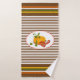 Pumpkin berries, leaves and stripes fall colours Thanksgiving bath towel set. It features a yellow and orange pumpkin with leaves and red berries. There is a brown and white striped pattern around it in brown accented with orange, yellow and green stripes.
