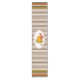 Pumpkin berries, leaves and stripes fall colours Thanksgiving table runner. It features a yellow and orange pumpkin with leaves and red berries. There is a brown and white striped pattern around it in brown accented with orange, yellow and green stripes.