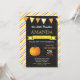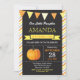 Pumpkin Birthday Invitation. Little Pumpkin Fall Birthday Invite. 1st First Birthday. Orange and yellow stripes, chalkboard background. For further customization, please click the "Customize it" button and use our design tool to modify this template.