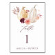 This wedding table number features watercolor white and yellow pumpkins adorned with burgundy, maroon, and blush pink flowers over fall leaves. For more advanced customization of this design, please click the BLUE DESIGN TOOL BUTTON above