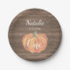 Pumpkin Fall First Birthday Party Paper Plates. Rustic Wood Background.