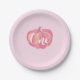 Pumpkin Fall First Birthday Party Paper Plates. Pink Background.
