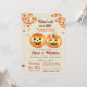 The invitation features orange pumpkins with jack-lantern faces and fall leaves. This design is perfect for a fall-themed gender reveal party.