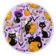 Cute black cats amongst pumpkins, halloween candy, bats, broom, stars, candy corn, acorns, full moon, autumn leaves and a cut ghost all set in a backdrop of light purple