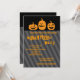 Fun and modern Halloween party invitation. Appropriate for any age. Features three pumpkins on a black background and dark grey stripes. Add your own wording.