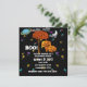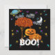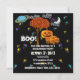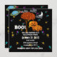 Halloween Invitation Featuring a Black Sky, Crescent Moon, Colourful Saturn, Clouds and more colourful stars abound. Cute Pumpkin Family standing next to a tree with orange fall colour Leaves and a Big BOO! With eyes atop the letters all inviting you to a most but not too spooky Halloween Harvest Party. Perfect for the Church Harvest Halloween Party too!