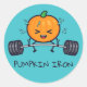 A silly pun which may prompt a quiet exhalation of amusement. A pumpkin pumping iron of course.