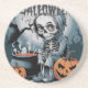 A spooky Halloween scene with a skeleton inside a pumpkin, surrounded by eerie elements.