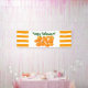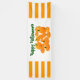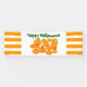 Cute digital drawing of various sized and shaped pumpkins with a fabric effect. The sides have orange and white horizontal stripes. In shades of orange and green on white, this design will be fun in the fall. This lovely banner is perfect for Halloween, Thanksgiving or fall wedding, birthday, or other events. Text reads, "Happy Halloween" and may be customized.