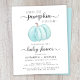 A cute, cheerful and budget-friendly couple's baby boy shower invitation featuring "A Sweet Little Pumpkin Is On His Way" written in grey typography and stylish script with swashes, and a pastel blue watercolor of a pumpkin. Personalize the names of the parents and the shower details in simple modern grey typography.