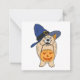 Whimsical cartoon dog in a wide wizard hat carries a glowing jack-o'-lantern. Bold lines, warm autumn colours, Halloween vibe, ideal for playful apparel and festive gifts.