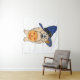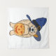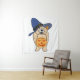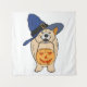 Whimsical cartoon dog in a wide wizard hat carries a glowing jack-o'-lantern. Bold lines, warm autumn colours, Halloween vibe, ideal for playful apparel and festive gifts.