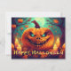 An orange pumpkin with a spooky face standing in the middle of many burning candles. The candles surround the pumpkin and cast a creepy, flickering light that emphasizes the carved features of the pumpkin face. The surroundings are dark and there is an eerie atmosphere, fitting for Halloween.