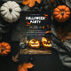 An invitation featuring spooky grinning pumpkins, skeleton heads, and orange bats.